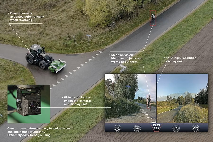 Unlimited VIEW 是一項全新功能,透過攝影機與機器視覺來解決上述問題。系統可搭配高解析度攝影機,例如安裝於前方作業機具的兩側,或作為拖車後方的倒車攝影機使用。當有其他車輛、行人或自行車進入攝影機視野時,機器視覺會自動辨識,並透過聲響警報與螢幕上的視覺符號,提醒曳引機操作人員。如在雖然擁擠但仍安全的環境中,也可選擇關閉聲響警報。